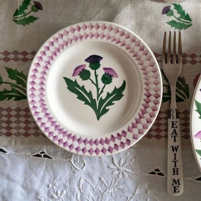 Thistles have an architectural shape and beauty to be admired but never touched, unless on an Emma Bridgewater Thistle Small Side Plate. This great new pattern harks back to earlier designs such as our 1997 Thistles pattern for the National Trust for Scotland which incorporated a salmon, a saltire and a Hebridean croft!
