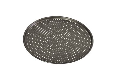 A heavy duty pizza tray for making homemade pizza. Features a double non-stick coating and perforated holes for better air circulation and a crispier crust.